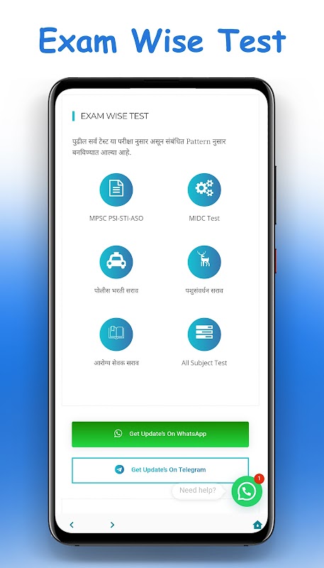 * Exam Wise Online Test : संयुक्त पूर्व परीक्षा, पोलीस भरती, MIDC, पशुसंवर्धन, आरोग्य सेवक या सर्व परीक्षा टेस्ट App वर देण्यात येतात.