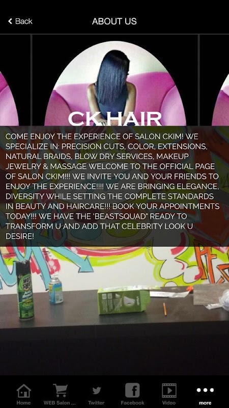 COME ENJOY THE EXPERIENCE OF SALON CKIM! WE SPECIALIZE IN: PRECISION CUTS, COLOR, EXTENSIONS, NATURAL BRAIDS, BLOW DRY SERVICES, MAKEUP JEWELRY & MASSAGE WELCOME TO THE OFFICIAL PAGE OF SALON CKIM!!! WE INVITE YOU AND YOUR FRIENDS TO ENJOY THE EXPERIENCE!!!! WE ARE BRINGING ELEGANCE, DIVERSITY WHILE SETTING THE COMPLETE STANDARDS IN BEAUTY AND HAIRCARE!!! BOOK YOUR APPOINTMENTS TODAY!!! WE HAVE THE 'BEASTSQUAD" READY TO TRANSFORM U AND ADD THAT CELEBRITY LOOK U DESIRE!
