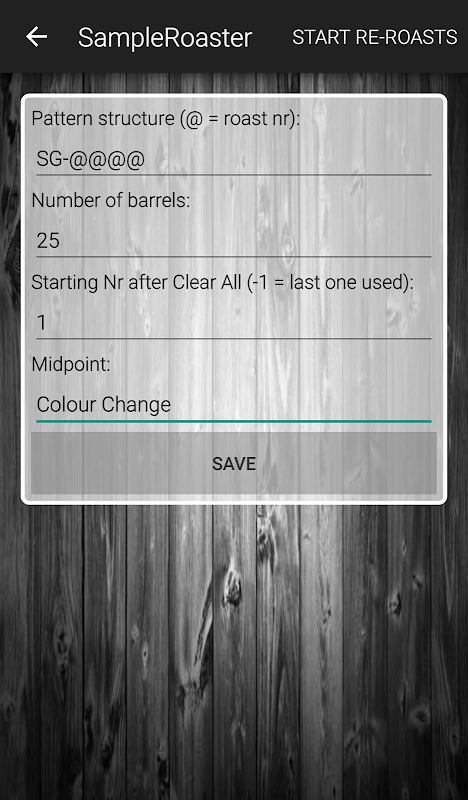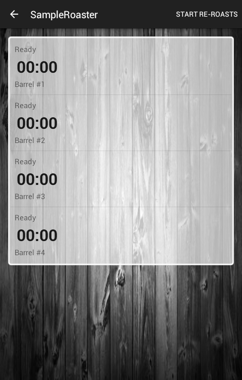 È per questo che ho progettato questo semplice cronometro applicazione multipla e implementato alcune caratteristiche pratiche come la marcatura prima crepa o un altro traguardo (cambiamento di colore, certa soglia di temperatura, etc.) Tutto sulla schermata principale è stato progettato in modo che possa essere facilmente e rapidamente controllato . Toccare un punto qualsiasi del timer per avviare / arrestare il cronometro, grande pulsante prima fessura e lo schermo non si spegne automaticamente durante la tostatura. È anche possibile impostare l'convenzione di denominazione per soddisfare il vostro sistema, sia che si tratti SG-0123 o campione # 35 o quello che volete. Il SampleRoaster manterrà incrementare il numero di campioni che iniziano con il numero della vostra scelta. Dopo la prima crepa si può facilmente vedere il vostro rapporto di sviluppo conteggio.