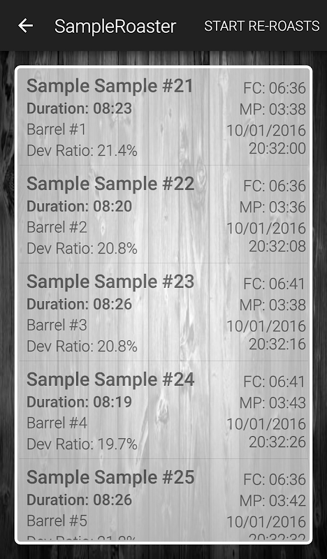 Quindi, fintanto che si versa i campioni nel roaster nell'ordine corretto, SampleRoaster terrà traccia di quali barile contiene quale campione. Tutti i dati salvati possono essere vista nella scheda storia da cui è possibile esportarli in Dropbox o inviate via e-mail. Dopo aver coppettazione possono poi facilmente verificare se ci potrebbe essere una ragione per cui la torrefazione alcuni campioni non ha segnato come previsto. Lasciate dire se un barile produce costantemente risultati inferiori, o se qualche errore di torrefazione sfuggito la vostra attenzione.