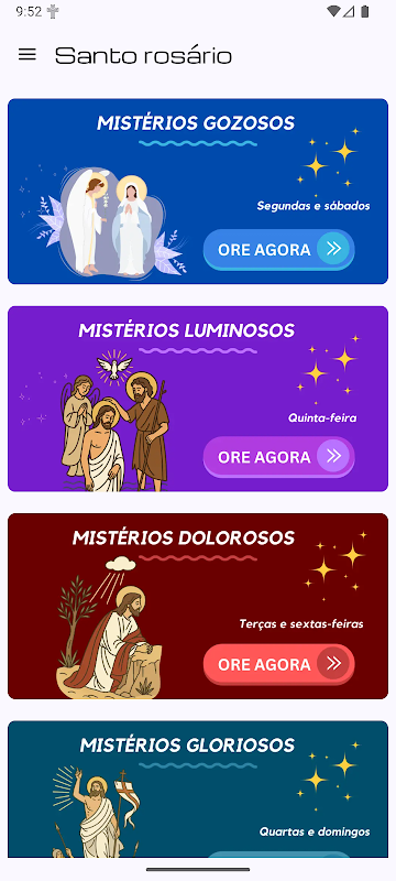 L'app organizza automaticamente la meditazione per te, seguendo i giorni della settimana. Avrai accesso a quattro serie di Misteri per una profonda contemplazione: