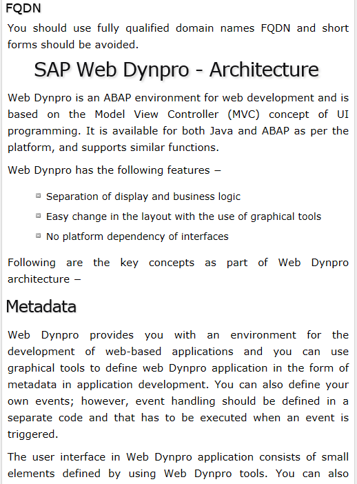 SAP Web Dynpro Tutorial for Beginners - Learn SAP Web Dynpro in simple and easy steps starting from basic to advanced concepts with examples including Overview, Configuration and Integration, Architecture, Navigation, Component, Mapping and Data Binding, Event and Actions, Application, URL of an Application, Creating an Application, Component Interfaces, Faceless Components, Assistance Class, Service Call in an Application, Using a Service Call, Debugging an Application, Version Management, Messages, Integration Messages, Personalization and Configuration, Portal Integration, Integrate WDA in Portal, Interactive Forms, SAP List Viewer(ALV), Administration, Monitoring an Application.
