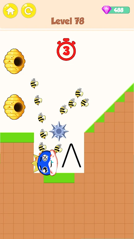 1. Disegnare una linea per salvare il mostro arcobaleno dalle api per vincere la partita. Puoi disegnare qualsiasi forma finché puoi salvare il mostro blu degli amici arcobaleno.