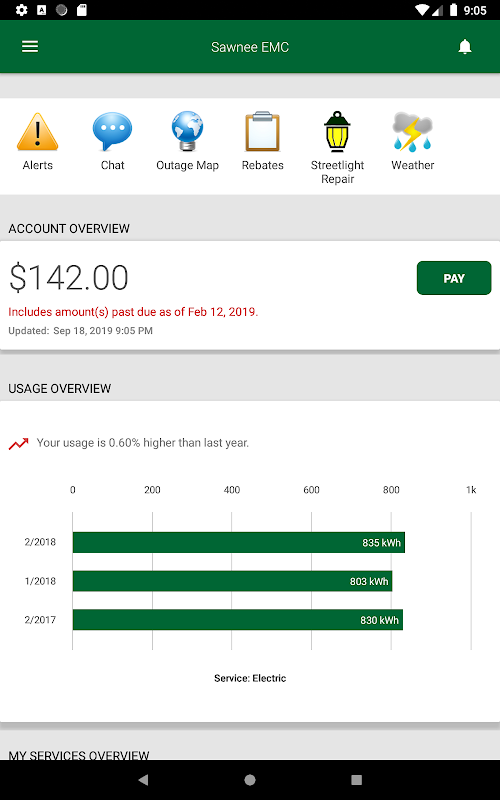 L'applicazione Sawnee EMC fornisce account soci gestione a portata di mano. I membri possono visualizzare il loro uso e la fattura, gestire i pagamenti, avvisare il servizio membro di conto e di servizio temi e ricevere messaggi di speciale da Sawnee EMC.