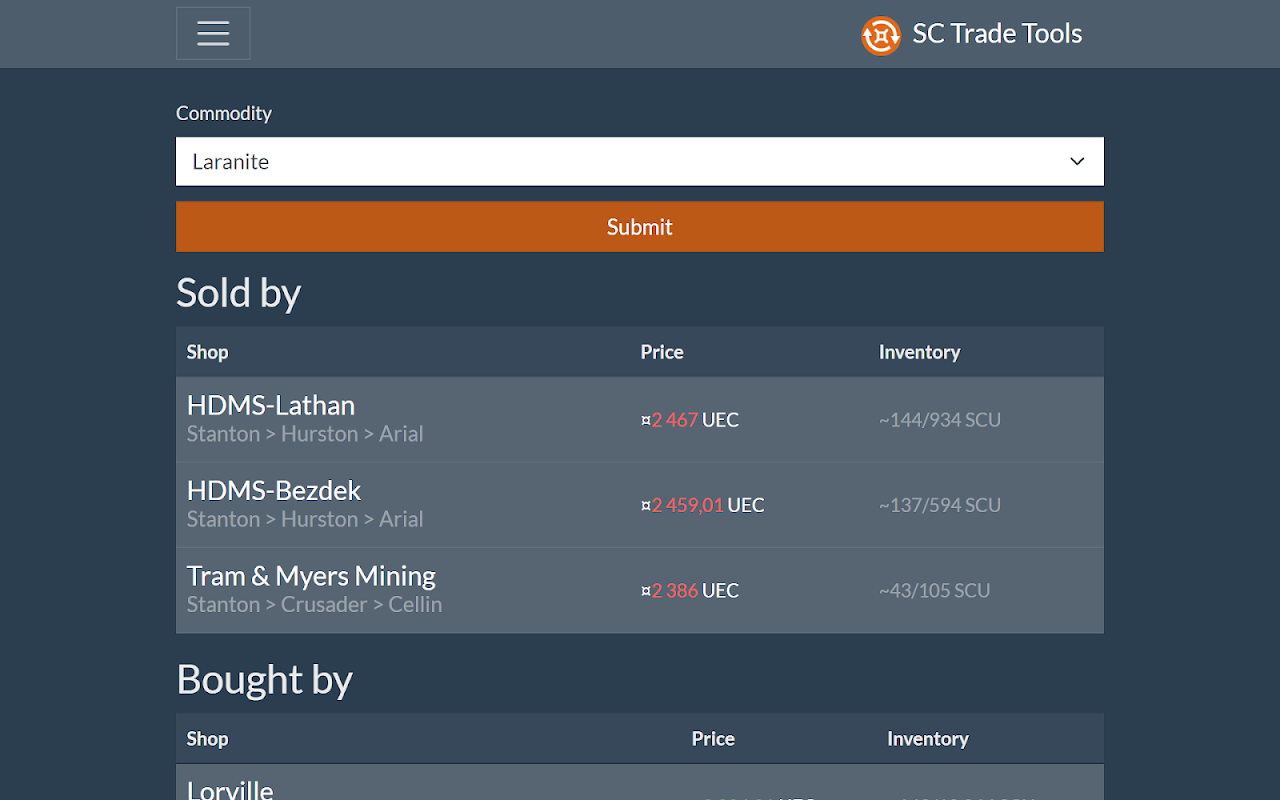 SC Trade Tools è una piattaforma in cui puoi trovare strumenti relativi al trading per Star Citizen, pensati su misura per te! Con dati sempre aggiornati, filtri potenti e algoritmi di ottimizzazione fantasiosi, troverai sicuramente la tua rotta commerciale ideale!