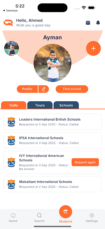 Sfoglia un'ampia selezione di scuole, visualizza profili dettagliati e confronta strutture, programmi e tasse. Prenota facilmente visite guidate alle scuole quando preferisci e invia le domande di iscrizione per tuo figlio direttamente dall'app.