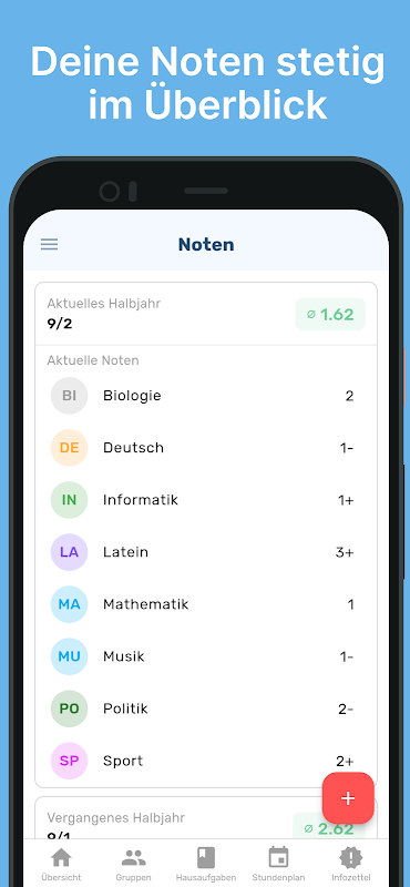 La migliore app scolastica per studenti, insegnanti e genitori: Orari, quaderno dei compiti, voti, schede informative, file e molto altro in un'unica app! La cosa migliore: tutto è sincronizzato con la tua classe scolastica. Ciò significa che solo una persona deve gestire il pianificatore scolastico. Questo lascia tempo per le cose importanti: oziare 🙈