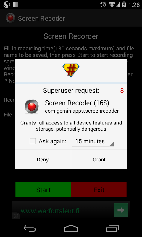 Record your phone screen as MP4 video to your SD card. Enjoy recording your favorite game and share it with your friends ;)