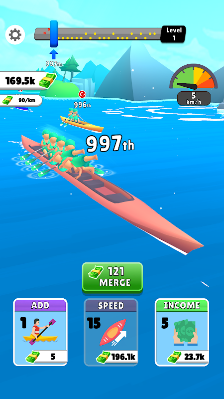 - Gameplay frenetico: scivola sull'acqua a un ritmo esaltante, alimentato dal numero di persone che aggiungi al tuo equipaggio.