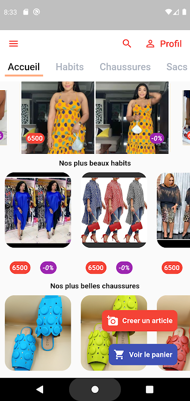 L'application contiens trois categories principales: Habits, Chaussures et sacs. A ce niveau, l'application sera appellee a évoluer.