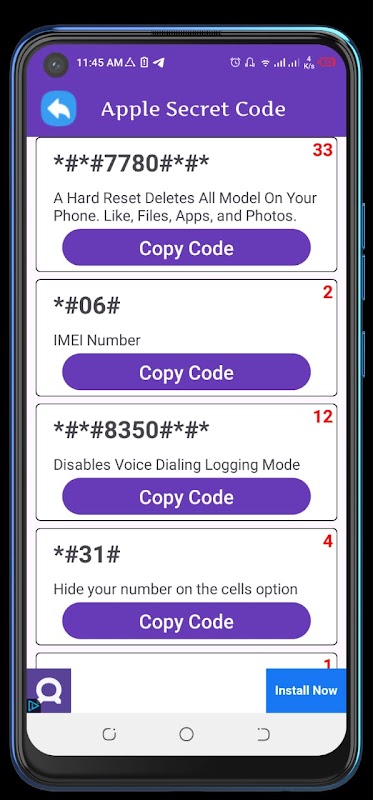 L'interfaccia dell'app è facile da usare. Puoi semplicemente fare clic sul codice e verrà copiato e incollato nella tastiera e otterrai le informazioni.