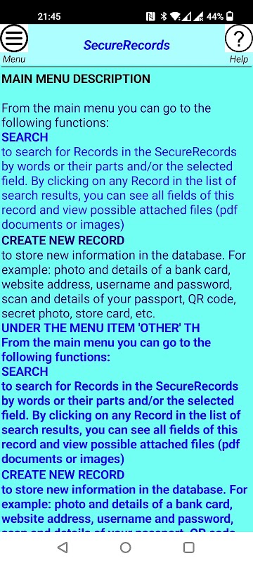 In SecureRecords puoi salvare tutti i tipi di informazioni e documenti/file in un formato crittografato, ad esempio: password, siti Web, carte di credito (informazioni e immagini), conti bancari (informazioni ed estratti conto), CHIAVI per CRYPTO, polizze assicurative, i tuoi passaporti e altri documenti governativi, tessere sconto, foto personali 'segrete', atti notarili per la tua casa, informazioni sulla tua auto e patente, codice QR COVID e quant'altro preferisci non mostrare ad altri.