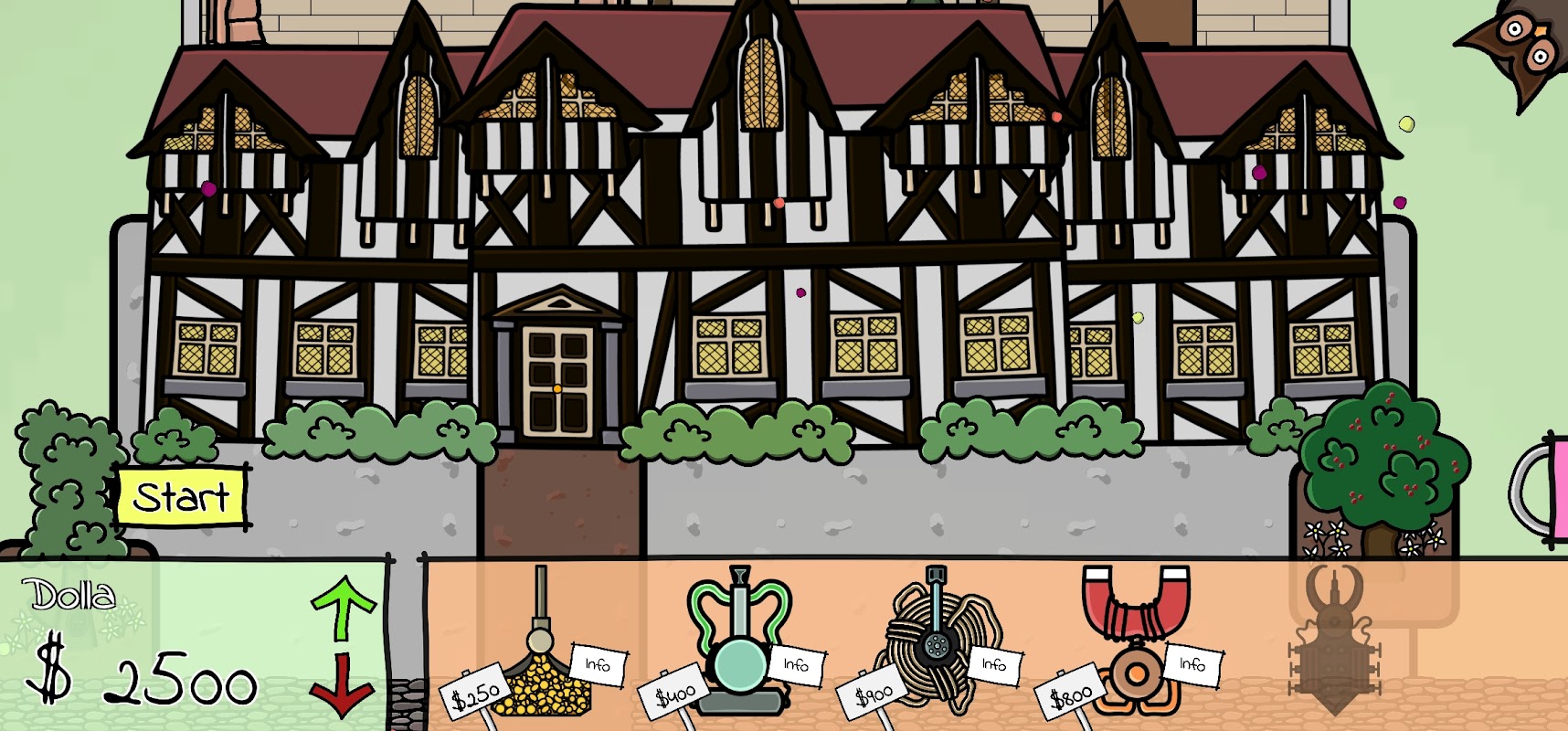 You can defend the house with the Goop Gun which slows the thief, the Coin Cannon which takes money from the thief but costs money to use, the Lasso Launcher which traps the thief for a short time, the Money Magnet which takes money from the thief without costing anything to run and the Expulsion Engine which teleports the thief back outside the building! Of course, each turret is upgradable in the turret upgrade shop.