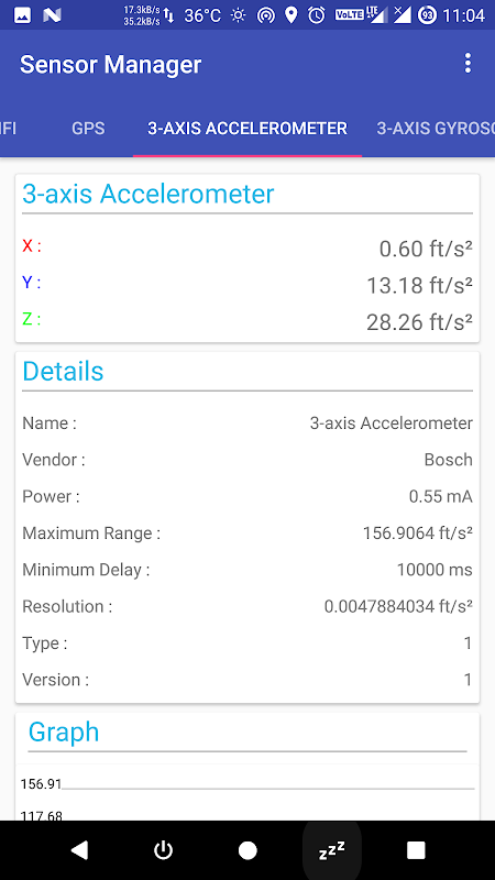 This application shows you the output of all sensors of your Android device, like accelerometer, magnetic field sensor, light sensor and a lot more, including their resolution, maximum range and power consumption.
