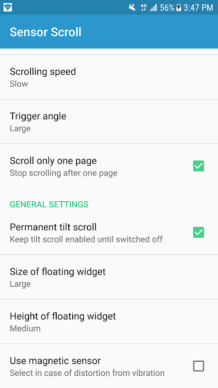 PLEASE NOTE: Sensor Scroll performs scrolling by doing an automated swipe gesture on behalf of the user. For technical reasons, this automatic scroll cannot be as smooth as manual scrolling. Accordingly, the scrolling speeds Sensor Scroll offers are not designed for reading along while scrolling, but for browsing through menus at medium speed, as well as for swift scrolling on after you are done reading a page of text.