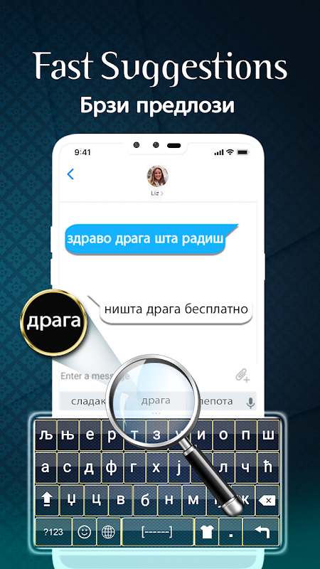 È inclusa anche la funzione di suggerimenti di parole che ti darà parole suggerite sulla parte superiore della tastiera durante la digitazione di testo serbo e testo inglese. Tastiera serba - La tastiera inglese serba o la tastiera serba per Android con la lingua inglese apparirà dopo averla selezionata come app predefinita per la tastiera dal metodo di immissione della lingua. Tastiera serba - Serbian English Keyboard è semplicemente un'app per la digitazione della tastiera che ti consente di scrivere solo la lingua serba e inglese che apparirà ogni volta sulla parte superiore della tastiera durante la digitazione. Scrivi facilmente tutte le lettere dell'alfabeto serbo e le parole in lingua inglese nei tuoi messaggi di digitazione mobile utilizzando questa tastiera divina o semplicemente l'app di digitazione tastiera chiamata tastiera serba inglese.