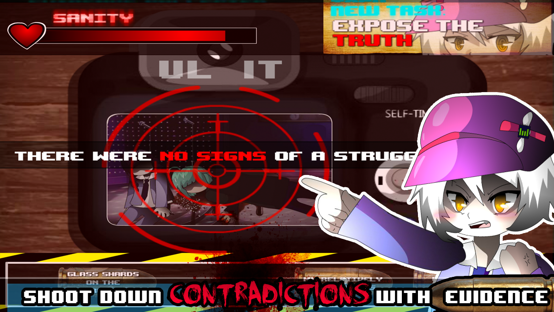 Utilizzare il vostro arsenale di proiettili prove per esporre le contraddizioni cruciali nel tuo pensiero in situazioni legali simili. Raccogliere le prove, abbattere le contraddizioni con il tuo proiettili prove stile Danganronpa, e svelare la verità dietro il caso!