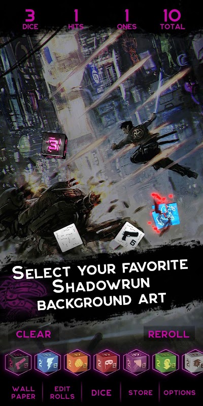 Quando acquisti dadi oltre il dado campione gratuito, ottieni un pezzo di arte Shadowrun che può essere usato come sfondo di un'app.