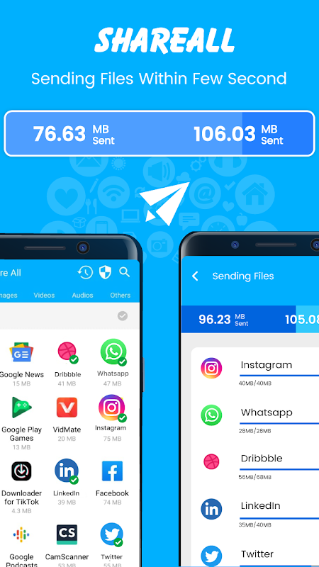 Benvenuto nell'app di condivisione rapida. Condividi file, film, video, app, immagini con altri telefoni Android mentre sei offline senza Internet. Invia ovunque e ricevi tutti i tipi di file in pochi secondi con la nostra app di trasferimento e condivisione di file facile da usare. Condivisione file veloce e invio illimitato alla massima velocità. Condividi consente agli utenti di inviare più file contemporaneamente. Trasferisci qualsiasi tipo di file da un dispositivo all'altro senza WIFI e utilizzo dei dati 4G/5G.