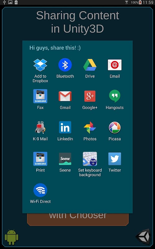 L'applicazione mostra come condividere i contenuti in Unity. Questo vi permetterà di prendere uno screenshot e condividerla attraverso un app esterno selezionato.