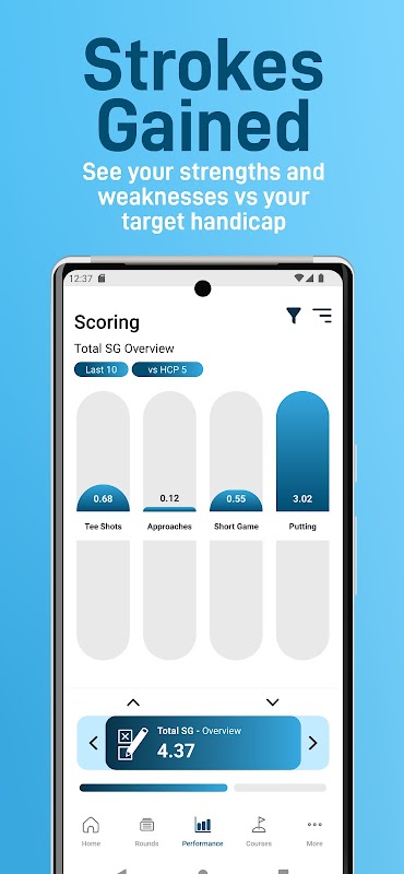 Solo per dispositivi di monitoraggio delle prestazioni: dopo aver giocato a golf, connettiti al tuo orologio Shot Scope e carica il tuo round per visualizzare i dati sulle prestazioni. Analizza oltre 100 statistiche sul tuo gioco, tra cui analisi dei colpi ottenuti, distanze dei bastoni, panoramiche delle buche e altro ancora. Utilizza queste statistiche per apprendere e comprendere il tuo gioco, per strutturare sessioni di pratica o informare il processo decisionale sul campo.