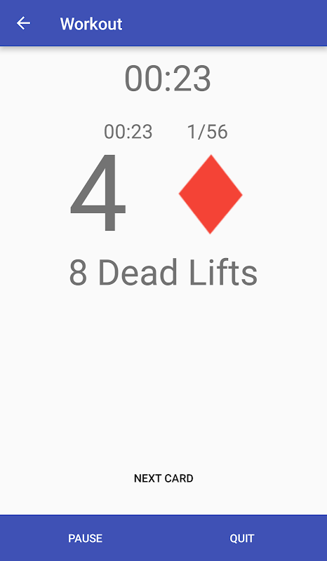 Gli esercizi vengono mappati a ogni seme. Eseguire il numero di ripetizioni per ciascun esercizio come determinato dal valore di ciascuna carta durante il tentativo di completare la piattaforma nel minor tempo possibile. Le successive carte di alto valore dello stesso seme sono parte del divertimento!