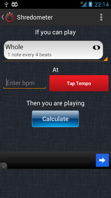 Are you a musician? Are you a metronome freak? You like shredding a lot? Then This app is for you! It can calculate how many Notes Per Second (NPS) you can reach by a given number of bpm (beats per minute). You can now break your own speed limits or compare your technique to others and test your skills!