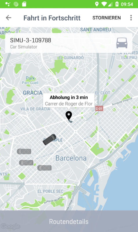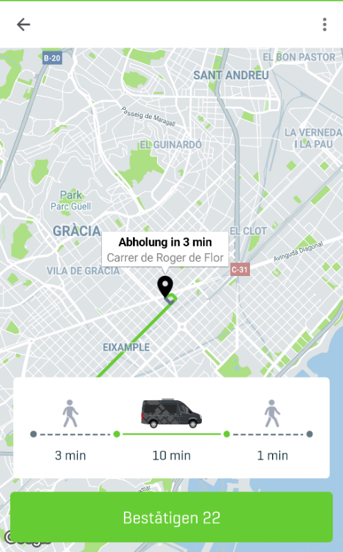 auf der Karte angezeigt. Die App nennt dir die maximale Wartezeit bis zur Abholung.