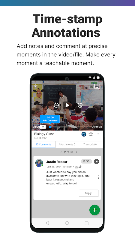 - Registra e rivedi: acquisisci lezioni, osservazioni, presentazioni e altro ancora per l'autoriflessione o la revisione collaborativa. Approfitta della trascrizione automatica per analizzare e riflettere facilmente sui contenuti registrati.