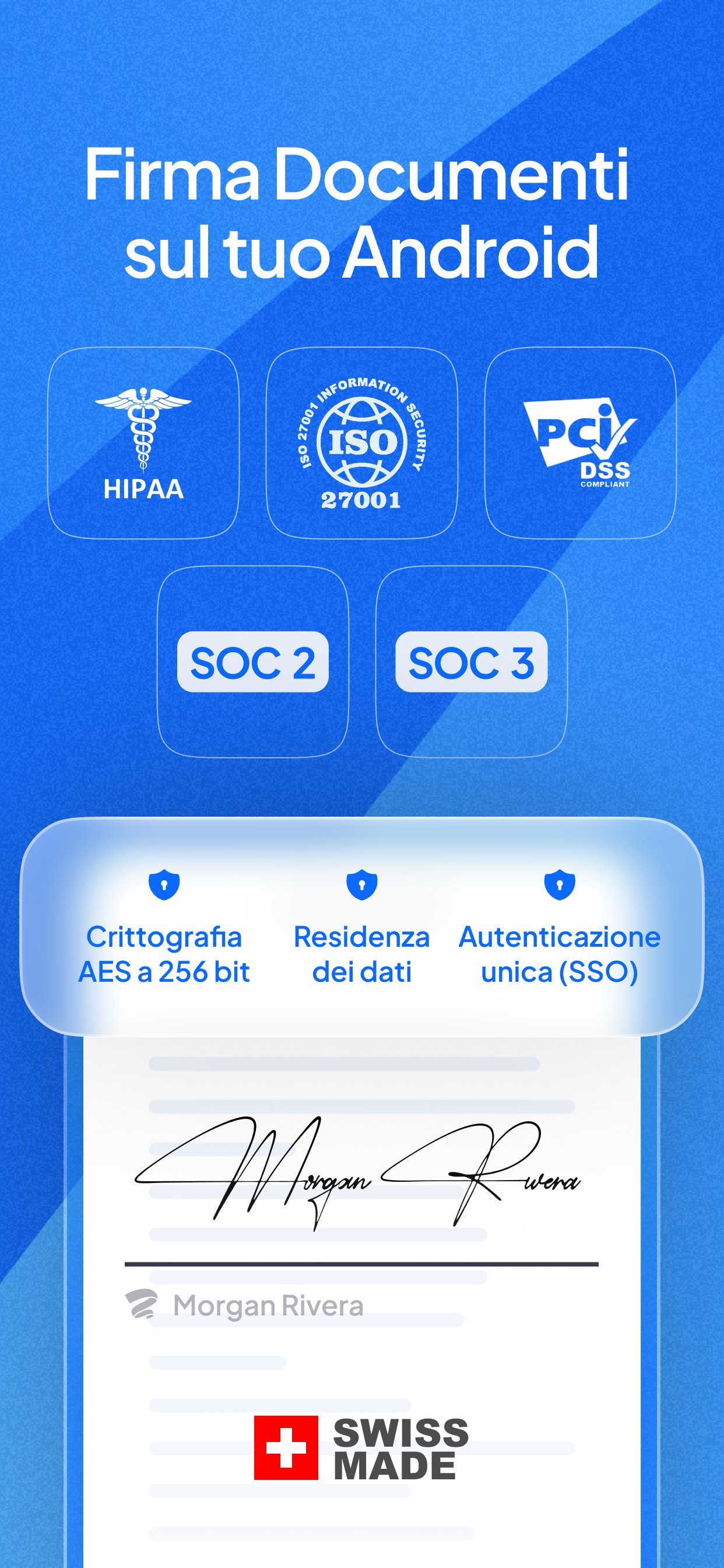Varie offerte di conformità: ci impegniamo a certificare noi stessi e la nostra piattaforma di firma elettronica per tutte le certificazioni e le conformità pertinenti, tra cui SOC 2, HIPAA, ISO 27001, GDPR, CCPA e altro ancora.