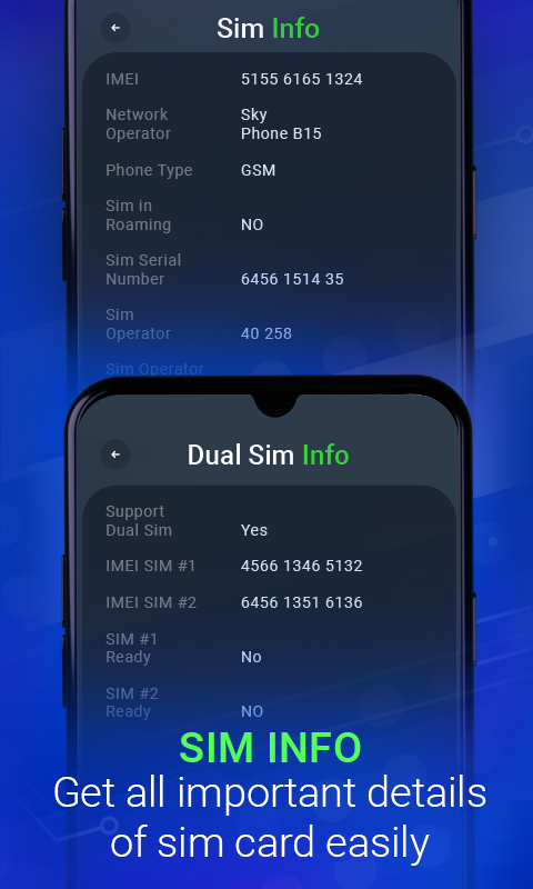 Ottieni facilmente le informazioni sul tuo telefono Sim, WIFI e informazioni sulla rete, potenza del segnale e velocità Internet.