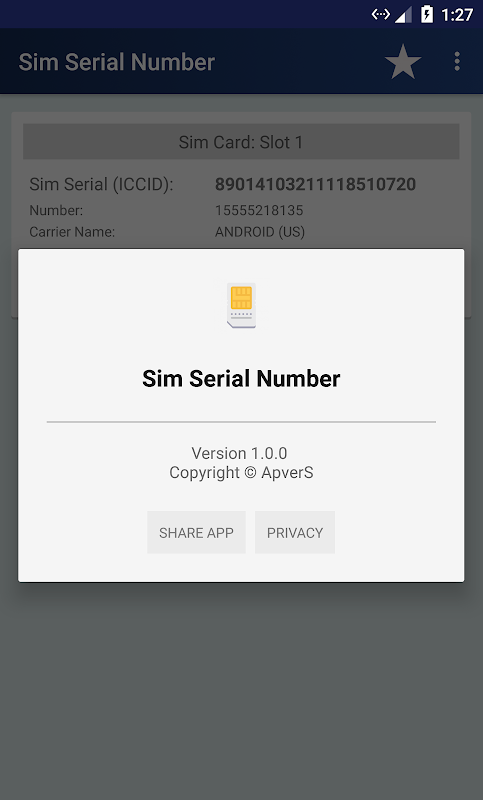 Applicazione semplice e rapida per estrarre il numero di serie della SIM, in altre parole, ICCID (Integrated Circuit Card Identifier) delle schede SIM installate sul telefono o sul tablet. ICCID è generalmente scritto sul retro della carta SIM. Questa informazione è soggetta a danni con molti mezzi, come: taglio della SIM per supportare micro o mini slot per schede, sfregamento del retro della carta da e verso la SIM Slot, ecc. Questa applicazione sarà utile per controllare il numero di serie. Le informazioni estratte possono essere condivise con altri.