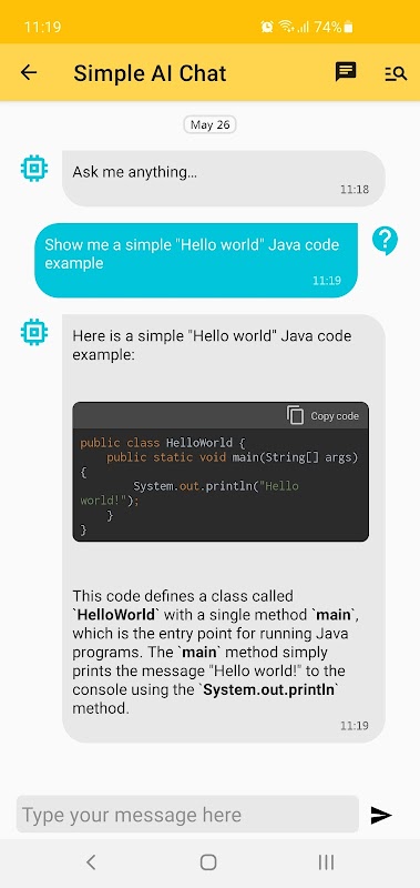 Scarica subito Simple AI Chat e sblocca il potere dell'intelligenza artificiale in tasca. Partecipa a conversazioni intelligenti, scopri nuovi argomenti e goditi un'esperienza di chat personalizzata come mai prima d'ora. Inizia a chattare con la nostra IA intelligente oggi stesso!