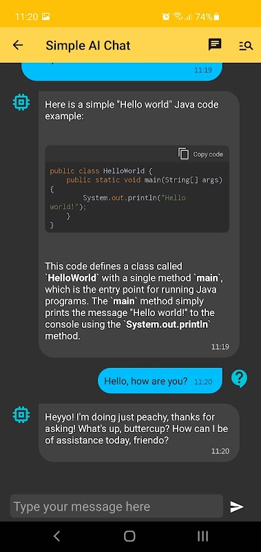 ‣ Disponibilità 24 ore su 24, 7 giorni su 7: indipendentemente dall'ora o dal giorno, Simple AI Chat è sempre accessibile. Sia che tu stia cercando compagnia durante le ore notturne o che tu abbia una domanda scottante nel bel mezzo della giornata, la nostra app è pronta per chattare con te.