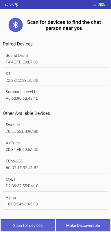 Simple Bluetooth Chat ti aiuterà a chattare con la persona più vicina utilizzando la tecnologia Bluetooth. Funzionerà senza Internet.