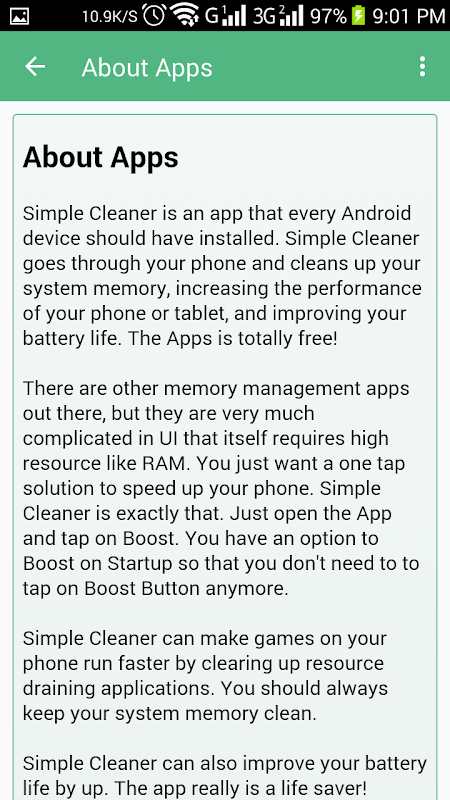 Ci sono altri la gestione della memoria apps là fuori, ma sono molto complicati nell'interfaccia utente che si richiede elevata risorsa come RAM. Volete solo una soluzione one tap per accelerare il vostro telefono. Semplice Cleaner è esattamente questo. Basta aprire l'applicazione e toccare Boost. Hai anche l'opzione per amplificare all'avvio in modo che non c'è bisogno di toccare il pulsante Boost più.