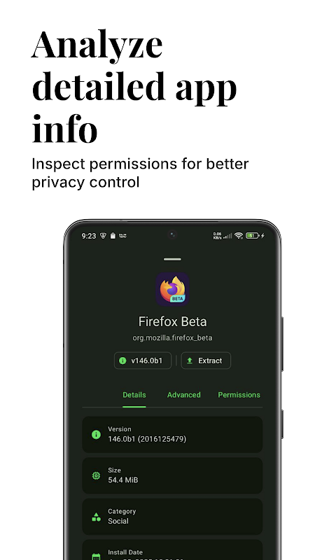 • Analizzare informazioni dettagliate sulle app: versione, dimensione e cartelle dati