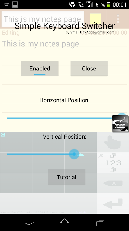 Questa è una applicazione semplice e leggero che consente di passare tra una tastiera comoda durante la digitazione. Non c'è bisogno di scorrere verso il basso il pannello delle notifiche o vai alla home page, basta cliccare sul tasto in qualsiasi momento galleggiante si desidera.
