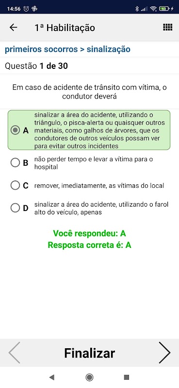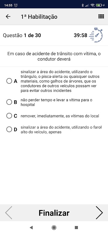 Prenderà la prima licenza nello Stato di São Paulo? Prova la tua conoscenza sul contenuto studiato in 45 ore di lezioni in classe con simulato Ufficiale Detran.SP online. Ci sono 30 domande a risposta multipla, scelti a caso, a cui rispondere in 40 minuti. Per essere approvato, è necessario ottenere almeno 21 domande (70%), così come la prova di teoria fatto oggi.