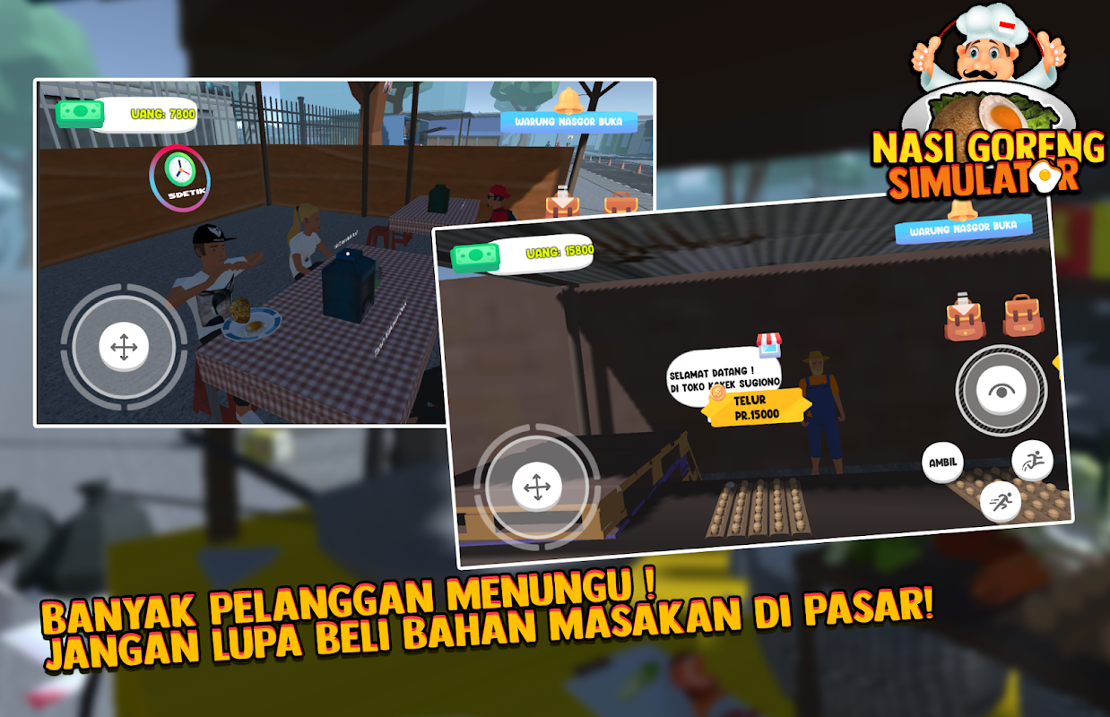 In questo gioco giocherai il ruolo di un simulatore nei panni di Mamang Perly che vende Nasi Goreng, in questo gioco simulerai cucinare, friggere, acquistare ingredienti e servire i clienti che acquistano riso fritto. In questo gioco di simulazione di riso fritto puoi andare in giro per la mappa del complesso di riso fritto, acquistare forniture da cucina al mercato, combattere nemici fantasma, trovare easteregg, combattere teppisti e animali feroci e umani toktok slebew anjay mabar