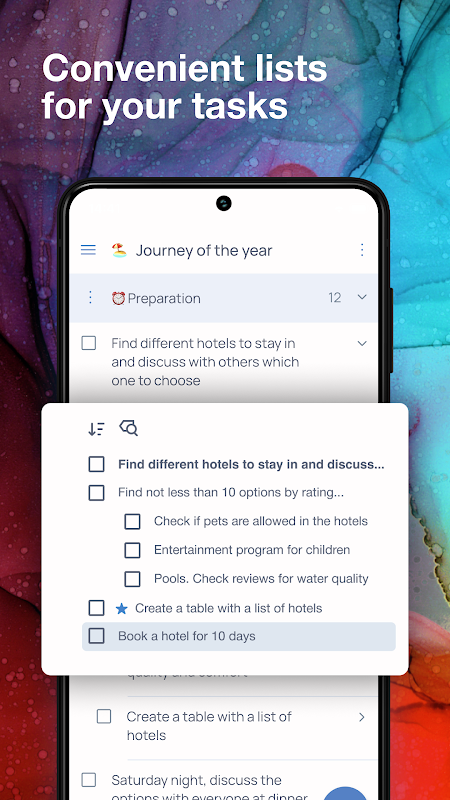 Organizza come pensi. Nidifica progetti e attività senza limiti. Etichette colorate per filtrare la lista. Checklist per spesa, valigia o flussi passo dopo passo.