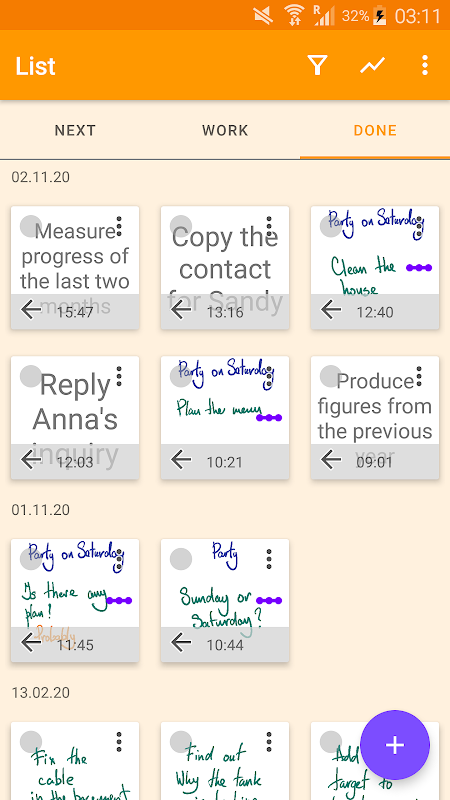 - Lo spazio di scrittura è infinito, il pollice attività viene salvato dalla parte, visualizzato l'ultimo