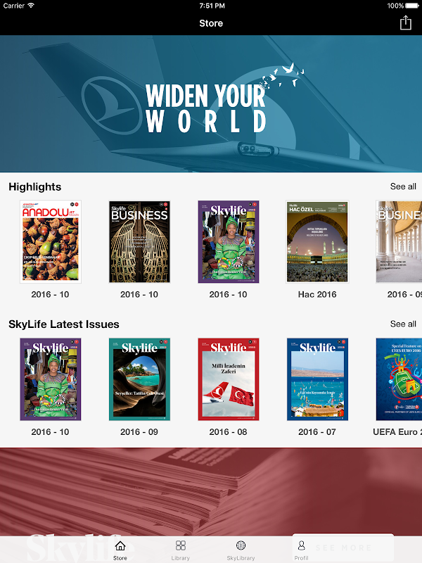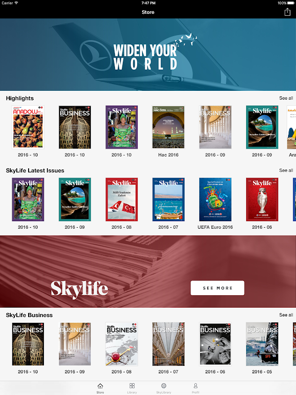 Creato da Turkish Airlines per tutti i suoi passeggeri e Miles & Smiles membri di godere durante o dopo il volo, Sky Library è un'applicazione innovativa free-of-charge biblioteca digitale con selezione di contenuti.