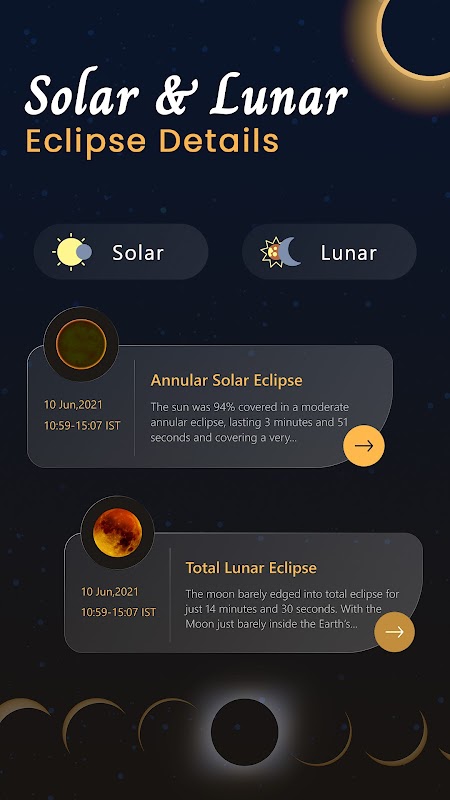 In questa opzione otterrai i dettagli dell'eclissi solare e lunare. È possibile ottenere dettagli come data, ora e altre informazioni.