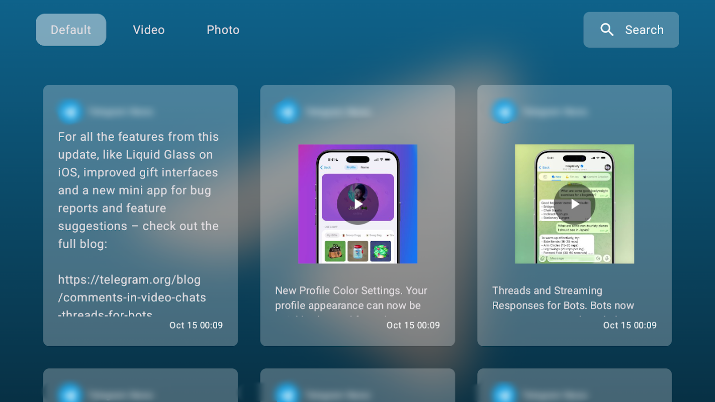 Smallgram porta il meglio di Telegram sulla tua Android TV, permettendoti di restare facilmente in contatto con canali, gruppi e amici direttamente sul tuo grande schermo. Scorri tra i tuoi messaggi, guarda foto e video, il tutto con un'interfaccia TV elegante e intuitiva.