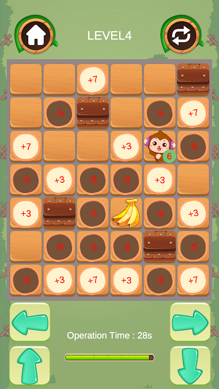 Questo è un gioco casual molto divertente e interessante. Nel gioco, usa i pulsanti su, giù, sinistra e destra per muoverti nella direzione corrispondente. Durante lo spostamento potresti incontrare vari oggetti scenici che aumentano o diminuiscono le fasi dell'operazione. Ogni passaggio ridurrà il numero di passaggi di uno. Raccogliendo oggetti di scena che aumentano o diminuiscono ragionevolmente il numero di passaggi operativi, puoi spostarti nella posizione finale della banana. Se mangi la banana con mosse limitate, vinci. Se la banana non viene mangiata entro operazioni limitate, il gioco fallirà. Allo stesso tempo, ci saranno limiti di tempo operativo durante l'esercizio. Se il tempo dell'operazione viene superato, il gioco verrà considerato fallito. Osserva rapidamente i vari oggetti di scena nel livello e trova il percorso più ragionevole, che ti consentirà di superare il livello più velocemente. Sbrigati e invita i tuoi amici a provare questo gioco insieme!