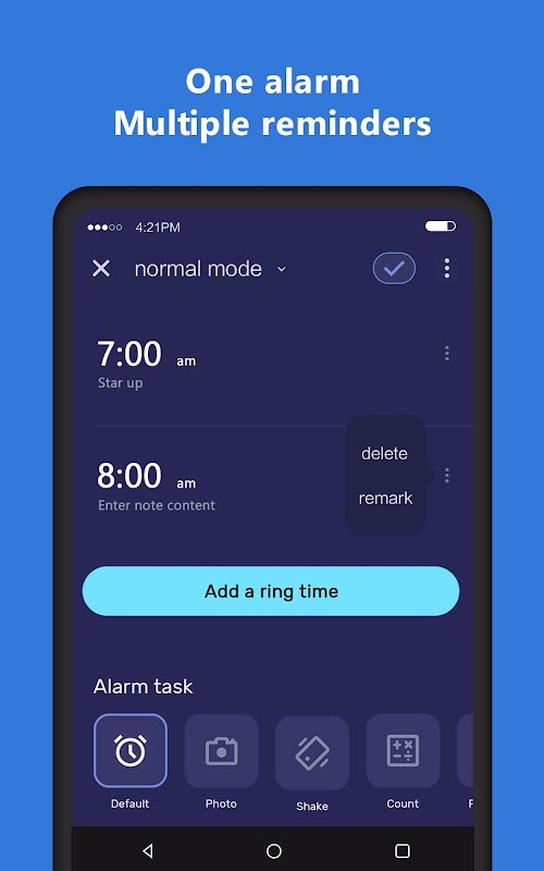 ⏰One Alarm: Set an alarm with multiple reminders at various intervals for simplicity, saving the hassle of creating several alarms for the same purpose.