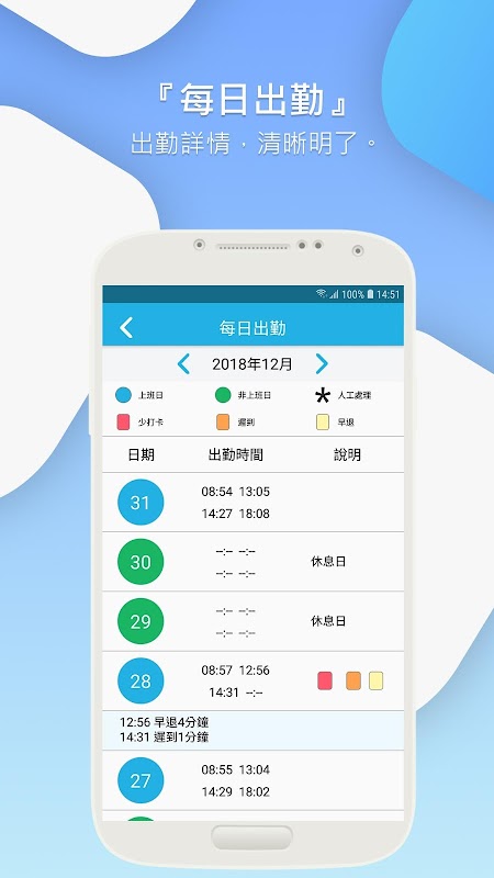 3. Ogni alba: mostra i dettagli di presenza su base giornaliera per ricordare a te stesso se hai meno punch, ritardo o partenza anticipata.