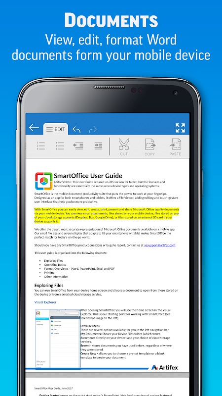 SmartOffice è un'applicazione di modifica dei documenti intuitiva e facile da usare progettata per soddisfare le esigenze del mondo mobile di oggi. Visualizza, modifica, crea, presenta e condividi documenti MS Office direttamente sui tuoi dispositivi mobili.