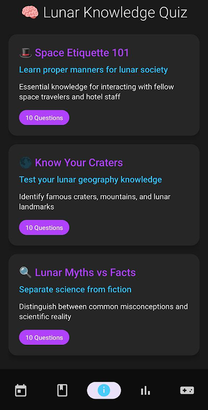 Metti alla prova le tue conoscenze lunari con quattro categorie di quiz pensate per stimolare e istruire. In Galateo Spaziale 101, impara come comportarti in assenza di gravità e in contesti lunari formali. Conosci i tuoi crateri ti aiuta a identificare i principali monumenti lunari e la loro importanza geologica. Miti e fatti lunari sfata i luoghi comuni più diffusi utilizzando risposte basate sulla scienza. Preparare i bagagli per la Luna ti assicura di capire cosa portare, cosa evitare e come prepararti per un viaggio sulla Luna. Ogni quiz include spiegazioni chiare per supportare l'apprendimento e la memorizzazione delle conoscenze. Tieni traccia dei tuoi progressi